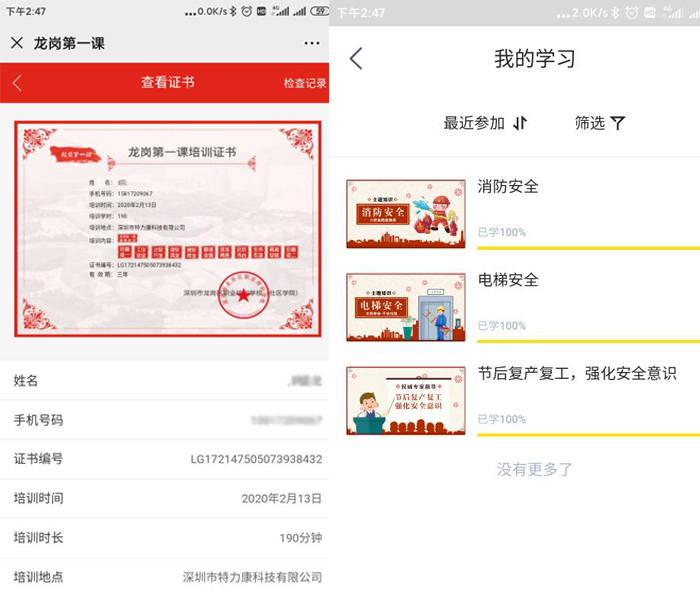 另外,防控期間為確保復工安全,我司全員進行了“龍崗第一課學習平臺”的培訓及“強安APP”的《節后復產復工,強化安全意識》的學習、考試、考證。