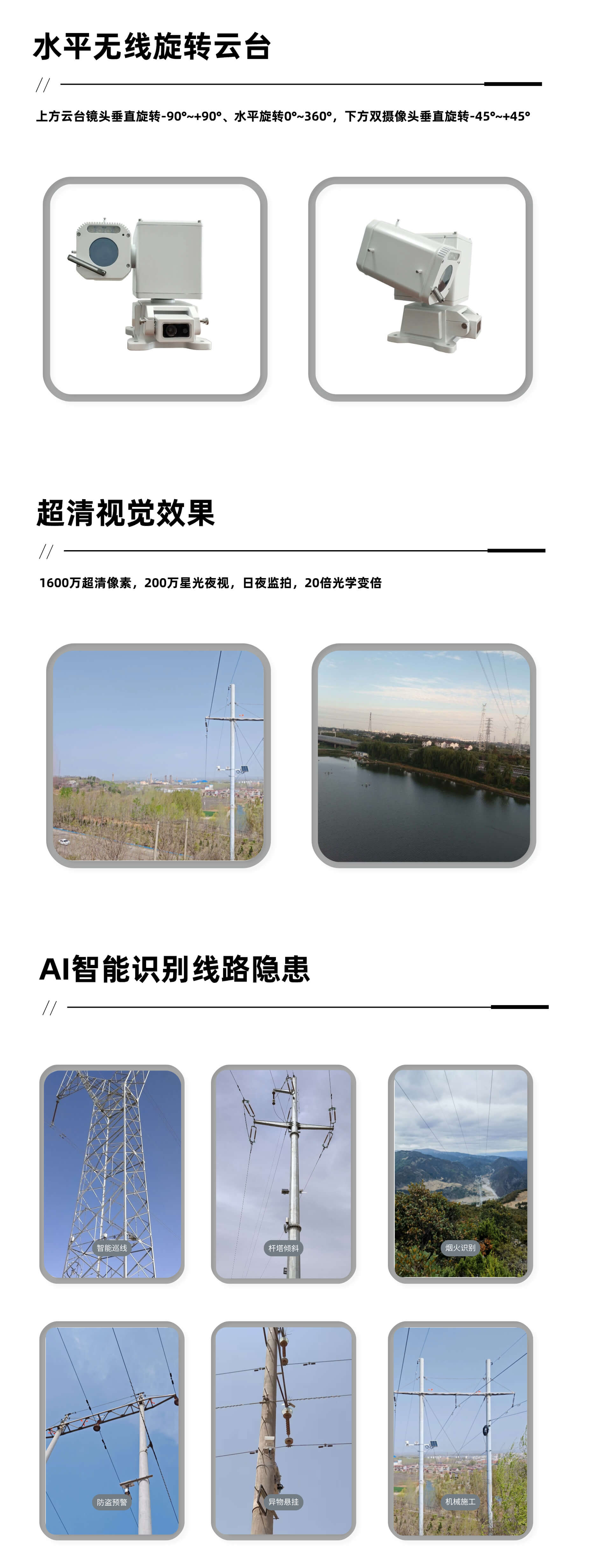 輸電線路智能多目視頻監控裝置,搭載水平360°、垂直+90°旋轉全向云臺攝像頭,成就全景視野監視,實時視頻瀏覽,三攝視頻,無論日夜,任何視角,即點即看,適配輕量級、低功耗AI算法,實現線路通道隱忠及桿塔本體缺陷的前端智能識別。