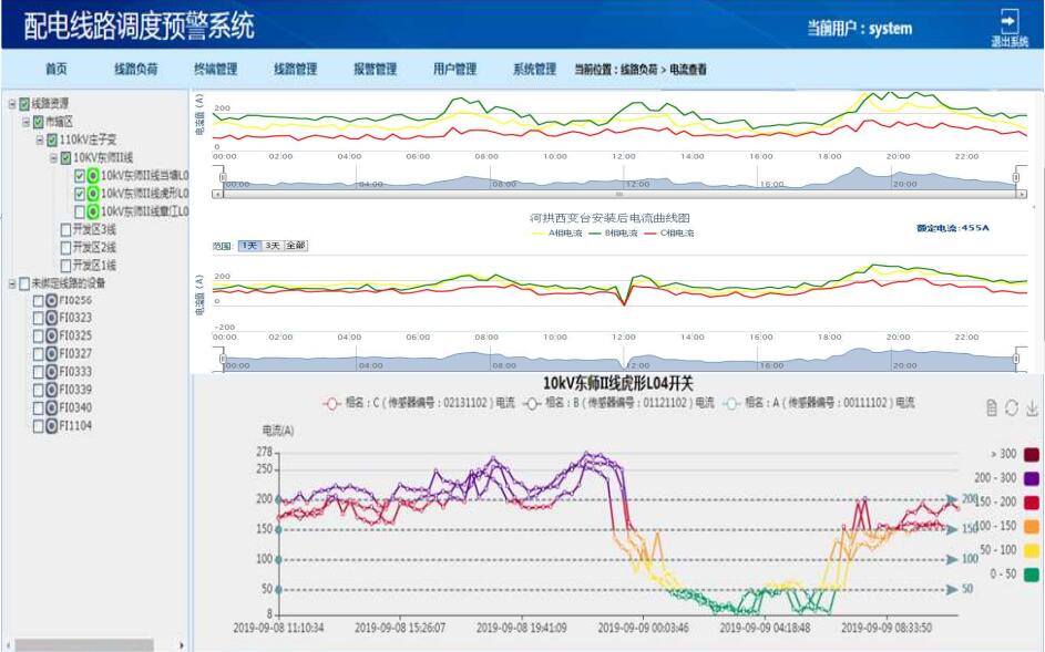 導線負荷溫升監測系統綜合運用了太陽能取電、無線通信及信息網絡等現代科學新技術。能實時準確地在線監測線路狀態,并將所采集到的負荷及溫度等信息發送回主站中心;主站對信息進行數據統計、分析、拓撲計算,確定負荷溫升狀態,從而引導工作人員定位隱患。為提高相關工作人員的效率、減輕勞動強度提供了一種強有力的手段;同時,溫度信息會通過短消息發送到供電局生產管理部門、線路專工、線路維護負責人等設定的相關人員的手機上,能有效提高線路故障檢測的自動化水平,及時為線路安全性能監測提供科學有效的依據,為電力的輸送及減人增效提供條件。
