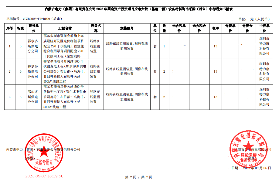 內蒙古電力(集團)有限責任公司物資供應分公司的采購項目,于2023年08月24日開標并已完成評審工作,同時向采購人提交了該項目采購情況的書面報告,現確認我單位為成交單位,中標通知如下: