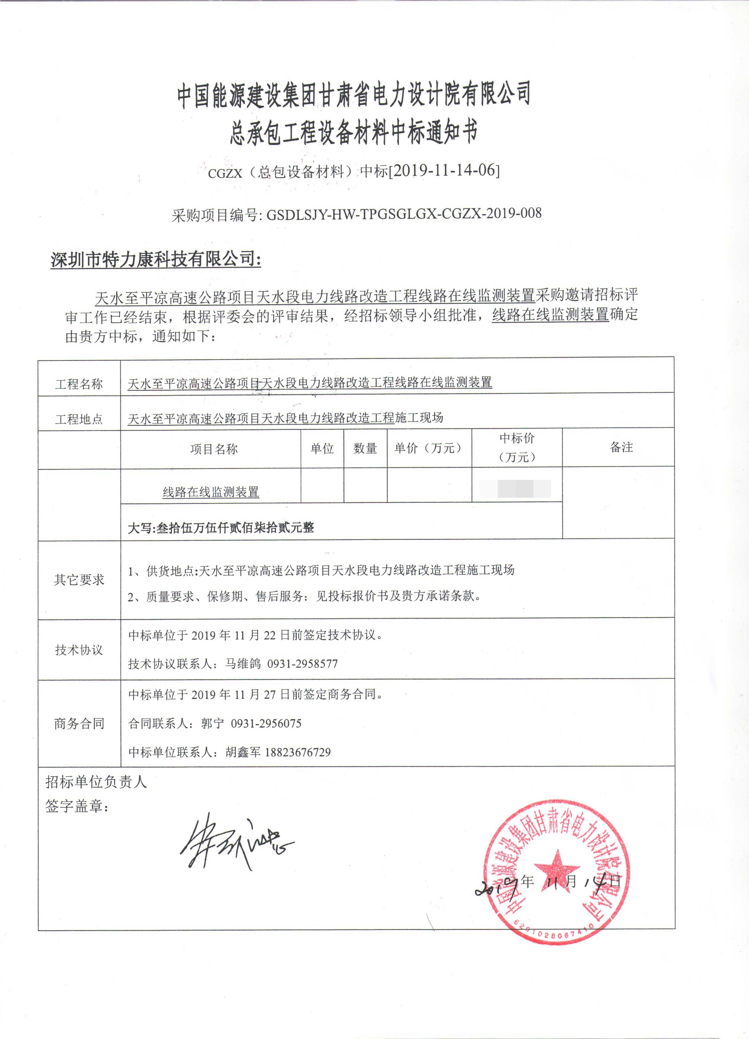 國網甘肅天水段電力線路改造工程線路在線監測采購招標評審工作已經結束,根據評審委員會評審結果,招投標領導小組批準,確定此次輸電線路在線監測裝置由我司深圳市特力康科技有限公司中標,現將公告示下:
