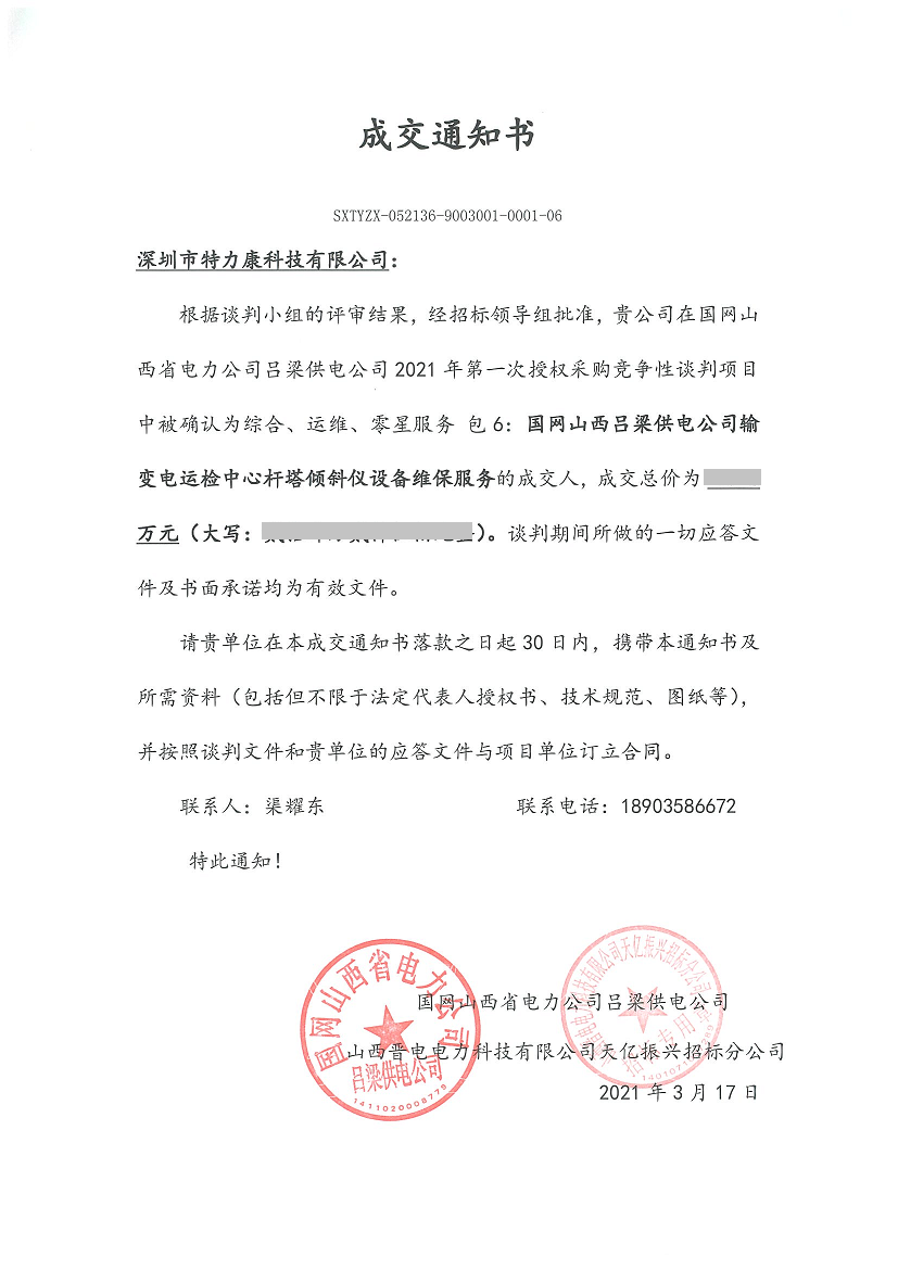 根據(jù)談判小組的評(píng)審結(jié)果,經(jīng)招標(biāo)領(lǐng)導(dǎo)組批準(zhǔn),貴公司在國網(wǎng)山西省電力公司呂梁供電公司2021年第一次授權(quán)采購競(jìng)爭性談判項(xiàng)目中被確認(rèn)為綜合、運(yùn)維、零星服務(wù)包6:國網(wǎng)山西呂梁供電公司輸變電運(yùn)檢中心桿塔傾斜儀設(shè)備維保服務(wù)的成交人,成交通知如下: