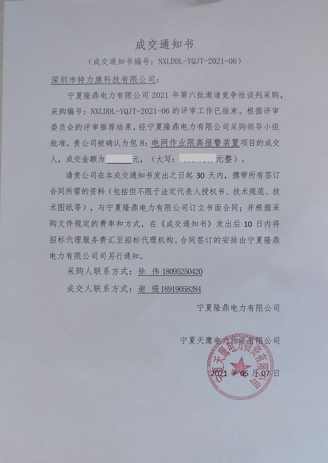 寧夏隆鼎電力有限公司2021年第六批邀請(qǐng)競(jìng)爭(zhēng)性談判采購,采購編號(hào): NXLDDL-YQJT -2021-06的評(píng)審工作已結(jié)束。根據(jù)評(píng)審委員會(huì)的評(píng)審?fù)扑]結(jié)果,經(jīng)寧夏隆鼎電力有限公司采購領(lǐng)導(dǎo)小組批準(zhǔn),我司被確認(rèn)為包8:電網(wǎng)作業(yè)限高報(bào)警裝置項(xiàng)目的成交人,中標(biāo)通知如下: