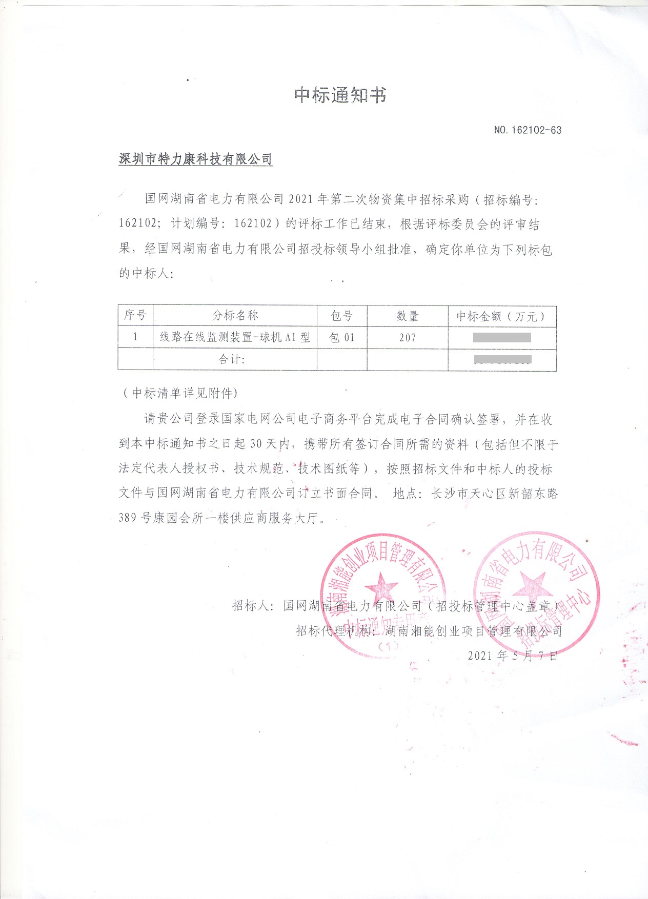 國(guó)網(wǎng)湖南省電力有限公司2021年第二次物資集中招標(biāo)采購(gòu)(招標(biāo)編號(hào):162102;計(jì)劃編號(hào): 162102) 的評(píng)標(biāo)工作已結(jié)束,根據(jù)評(píng)標(biāo)委員會(huì)的評(píng)審結(jié)果,經(jīng)國(guó)網(wǎng)湖南省電力有限公司招投標(biāo)領(lǐng)導(dǎo)小組批準(zhǔn),確定我司為線路在線監(jiān)測(cè)裝置-球機(jī)AI型標(biāo)包的中標(biāo)人,中標(biāo)通知如下: