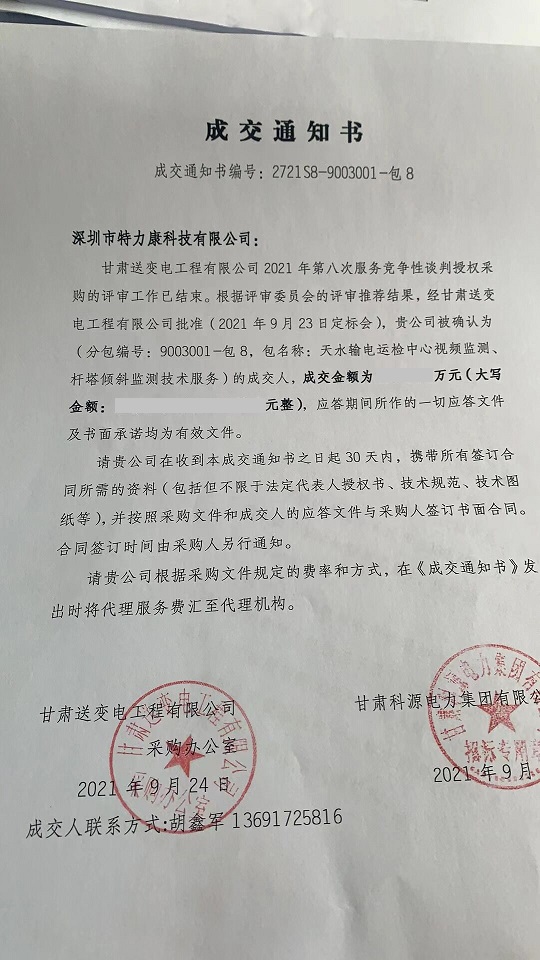 甘肅送變電工程有限公司2021年第八次服務(wù)競爭性談判授權(quán)采購的評(píng)審工作已結(jié)束。根據(jù)評(píng)審委員會(huì)的評(píng)審?fù)扑]結(jié)果,經(jīng)甘肅送變電工程有限公司批準(zhǔn)(2021 年9月23日定標(biāo)會(huì)),貴公司被確認(rèn)為(分包編號(hào): 9003001-包8, 包名稱:天水輸電運(yùn)檢中心視頻監(jiān)測、桿塔傾斜監(jiān)測技術(shù)服務(wù))的成交人,中標(biāo)通知如下: